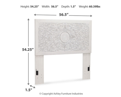 Series Features:White wash replicated worn through paint with authentic touch. Exquisite carved medallion pattern on the headboard and cases. Headboard legs have multiple height options for optimal relationship to bedding height. Cases feature ornate hardware in a worn through painted look. Drawer interiors are lined with a replicated linen design for a clean, finished look. Bedroom collection features case pilasters for a substantial look. Panel headboards (53,87,57) are compatible with EB1181 platform beds (111,112,113). Slim profile dual USB charger located on the back of the night stand tops. Mirror (36) has the versatility to mount on the dresser or to the wall horizontally or vertically. Safety is a top priority, clothing storage units are designed to meet the most current standard for stability, ASTM F 2057 (ASTM International). Drawers extend out to accommodate maximum access to drawer interior while maintaining safety.